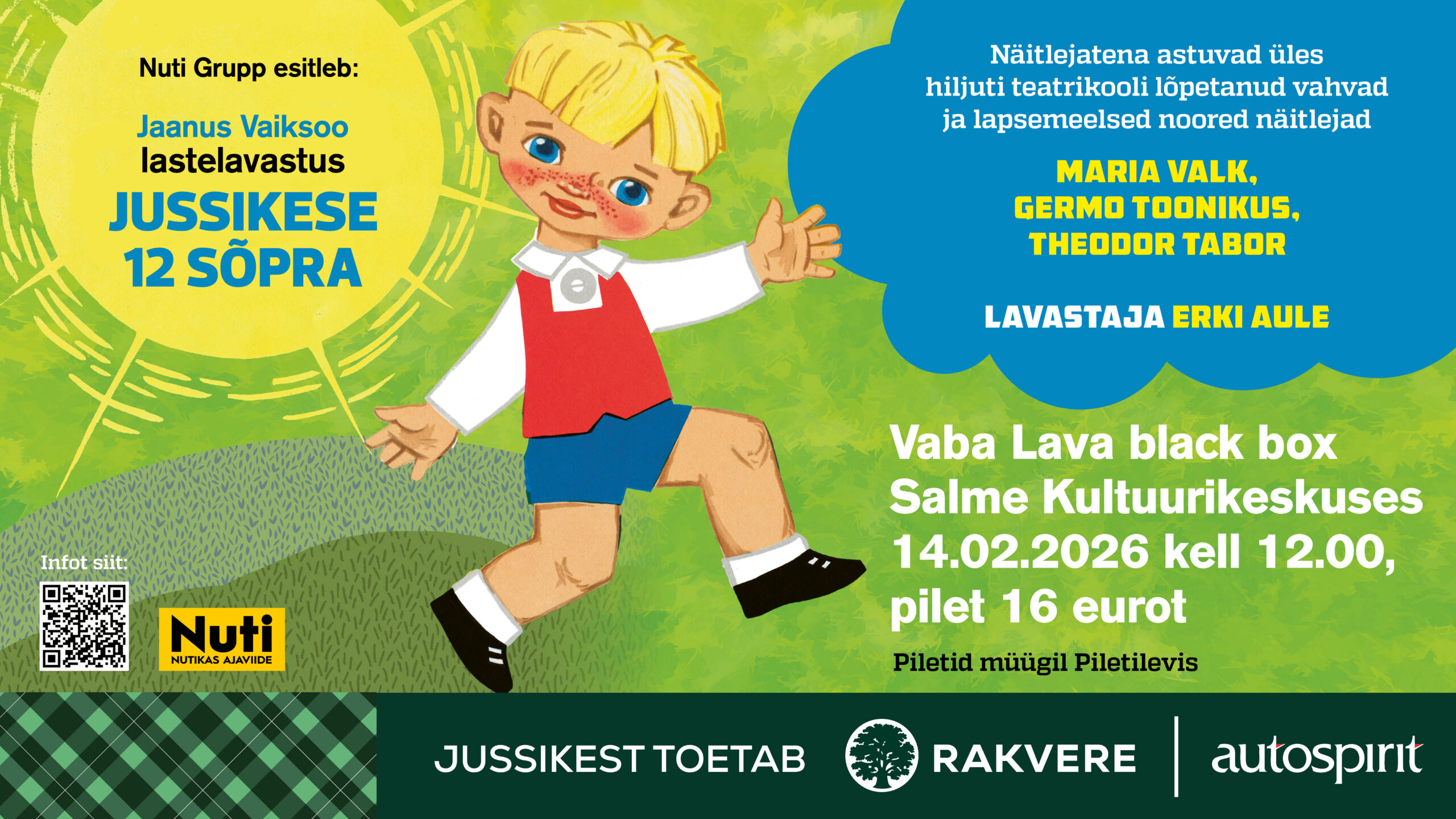 Raamatu põhjal valminud lavastuses astuvad üles hiljuti teatrikooli lõpetanud vahvad lapsemeelsed näitlejad Maria Valk, Theodor Tabor ja Germo Toonikus.